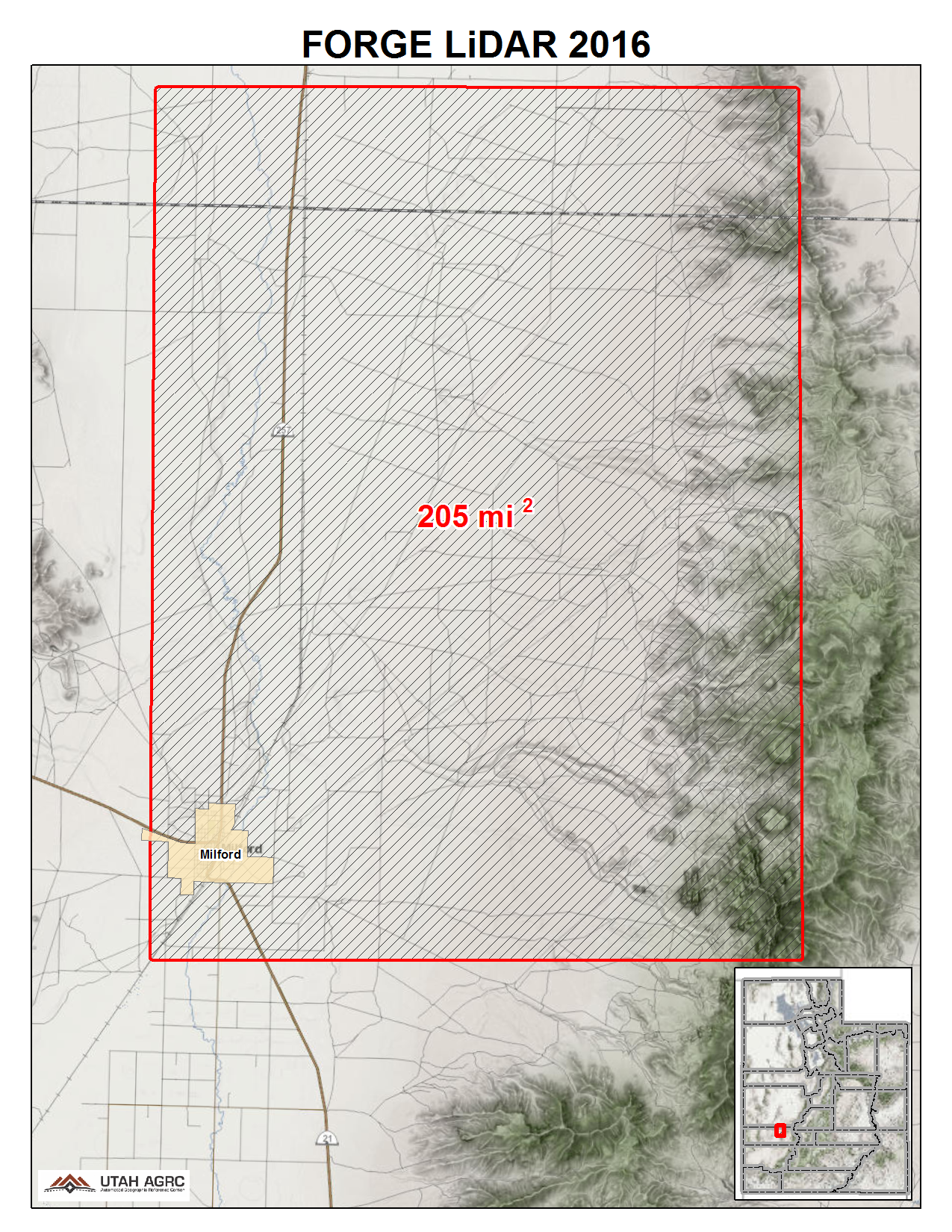 During the Fall of 2016 UGRC and the Utah Geological Survey acquired ~205 square miles of 8 points per meter Quality Level 1 Lidar of The Frontier Observatory for Research in Geothermal Energy (FORGE) area around Milford, Utah in Beaver and Millard Counties in western Utah. The 0.5 meter resolution bare earth DEMs and first-return/highest-hit DSMs in .img format have a 10.0cm vertical RMSE accuracy and are available for download. The LAS point clouds are available from The National Map , opens in a new tab . This elevation data was collected between October 26 and November 3, 2016.