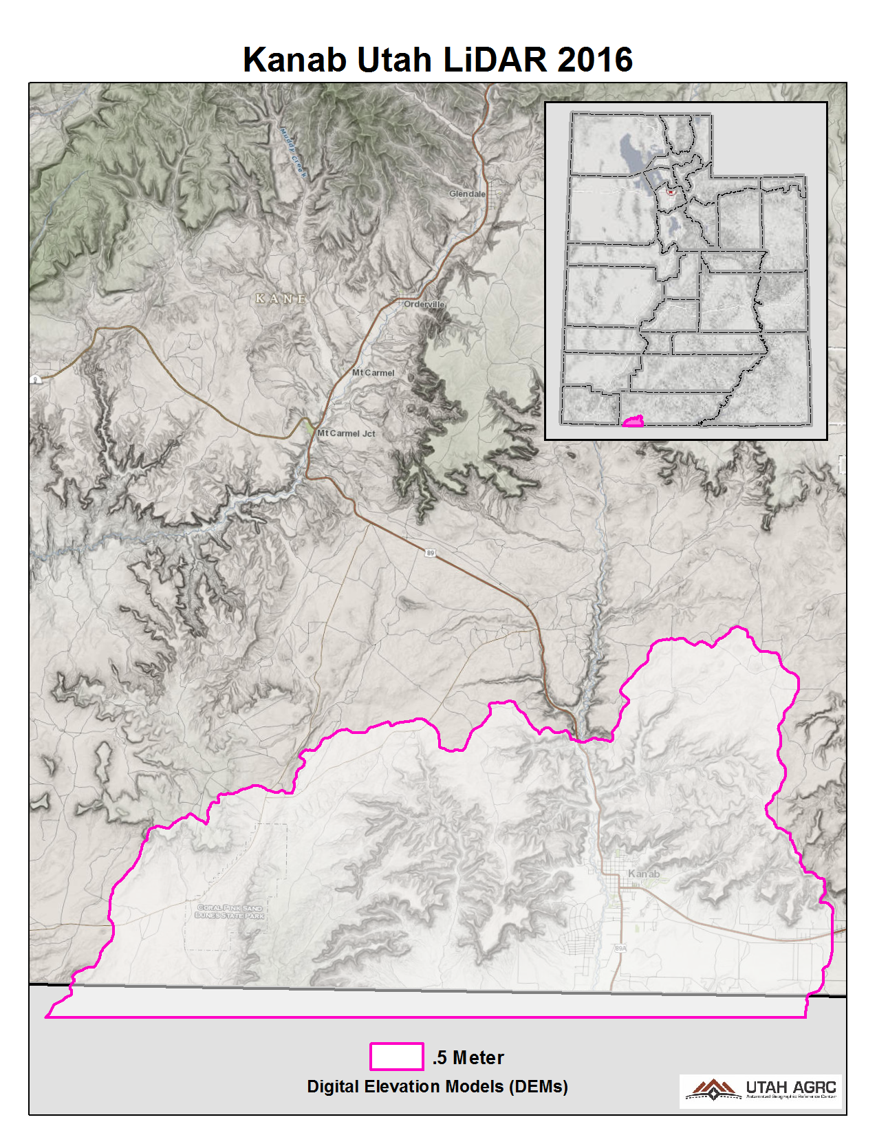 During 2019 UGRC and the Utah Division of Emergency Management acquired ~6,114 square miles of 2 points per meter Quality Level 2 Lidar of Kane County and portions of the Greater Sevier Watershed. The 1 meter resolution bare earth DEMs and first-return/highest-hit DSMs in .tif format have a 10.0cm vertical RMSE accuracy and are available for download. The LAS point clouds are available from The National Map , opens in a new tab .