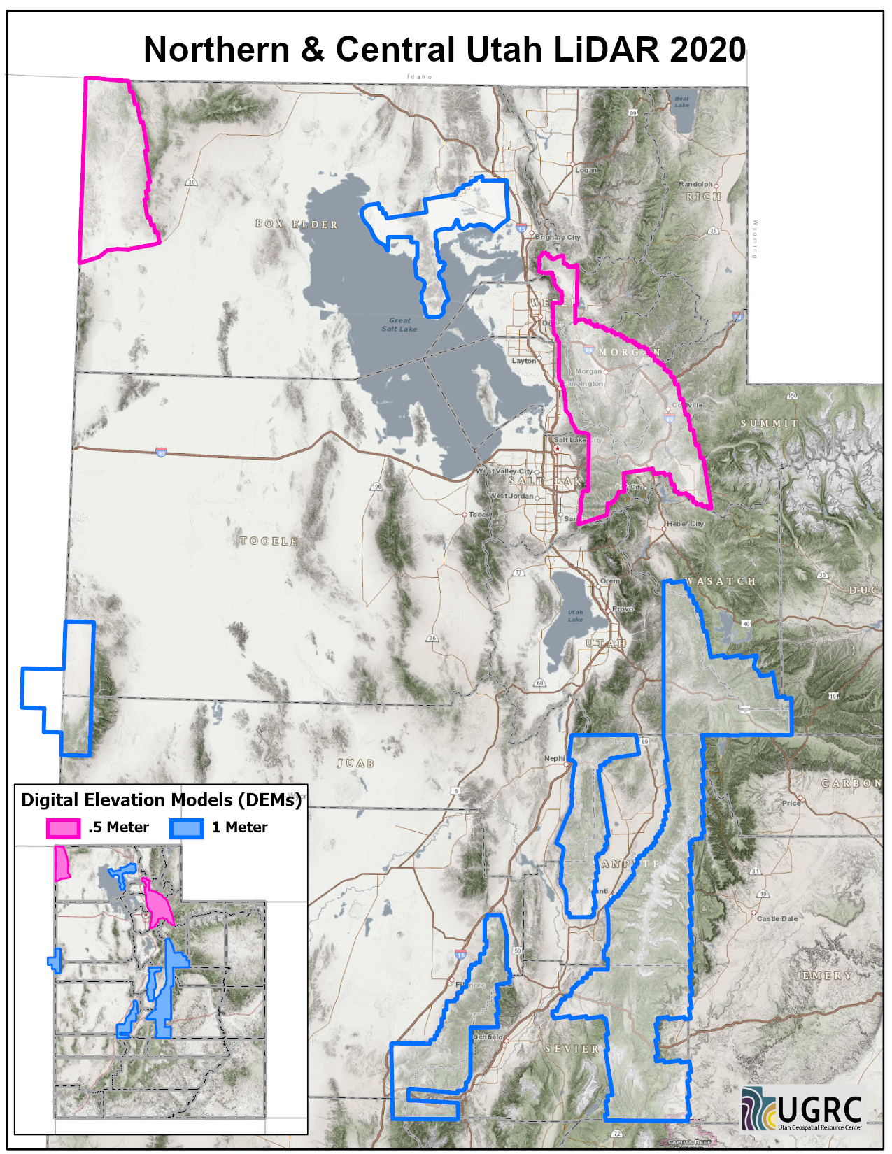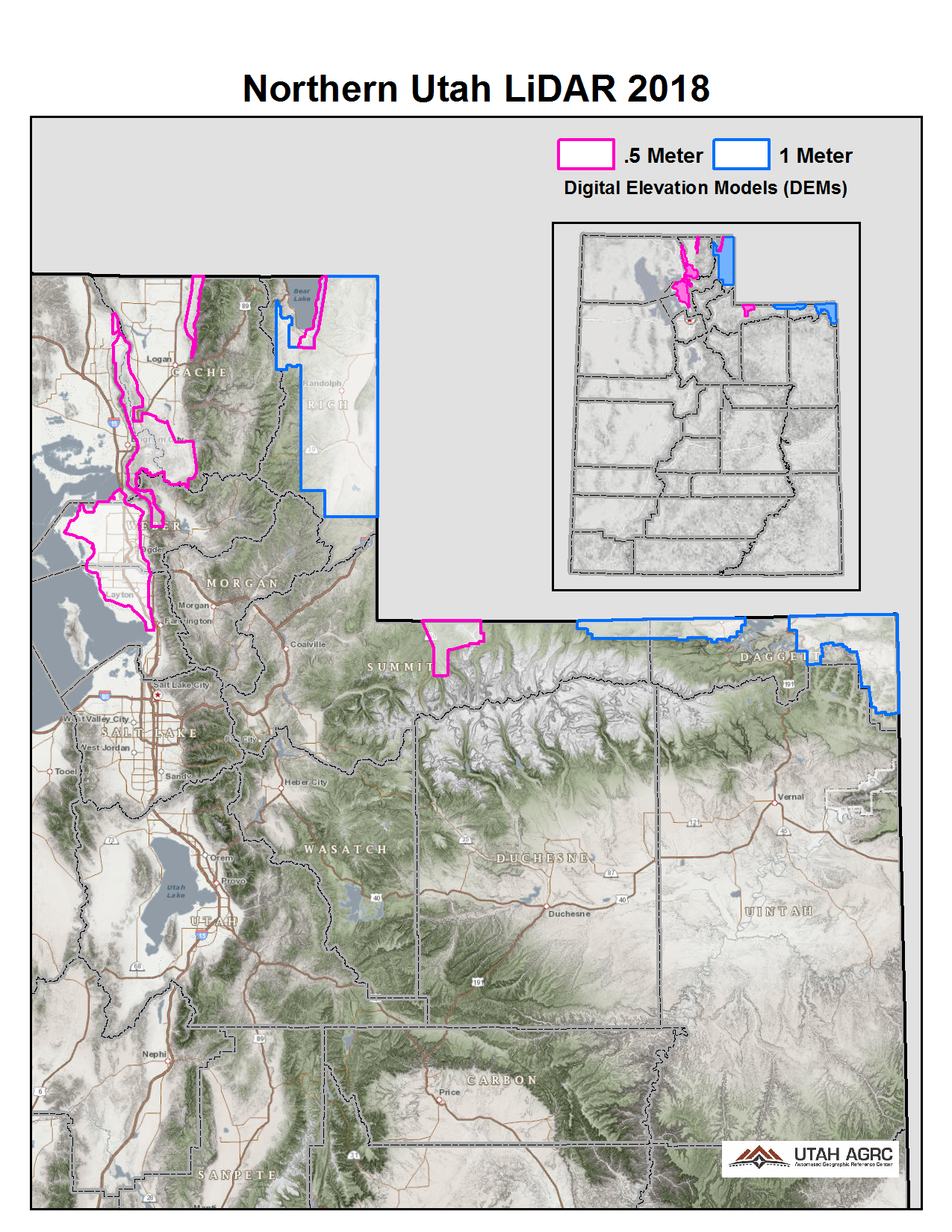During 2018 UGRC, the Natural Resource Conservation Service (NRCS), and the Utah Geological Survey (UGS) acquired ~2,271 square miles of 8 points per meter Quality Level 1 Lidar for areas in Northern Utah. The 0.5 meter resolution bare earth DEMs and first-return/highest-hit DSMs in .tif format have a 10.0cm vertical RMSE accuracy and are available for download. The LAS point clouds are available from The National Map , opens in a new tab .