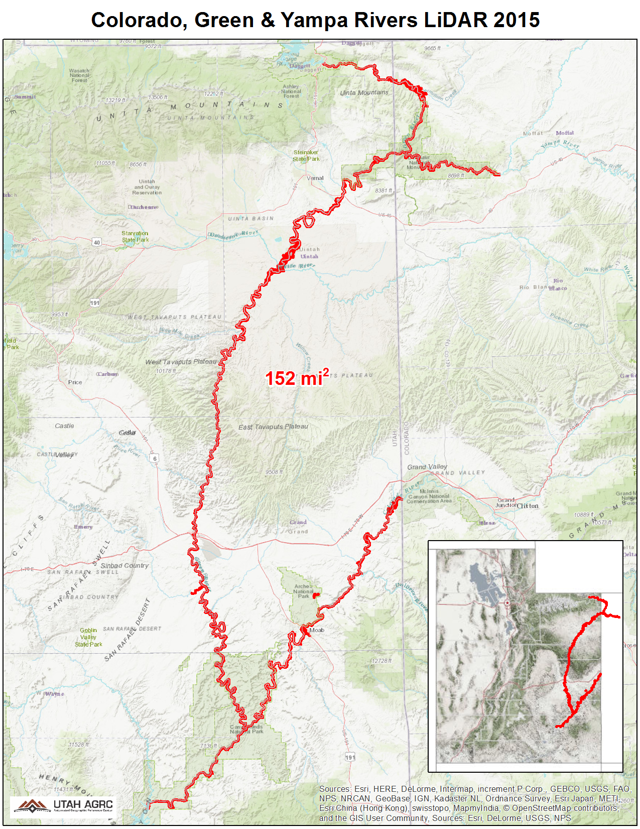 During late Fall of 2015 the Utah Division of Forestry, Fire & State Lands and the U.S. National Park Service acquired ~152 square miles covering ~680 river miles of 8 points per meter Lidar of the Colorado, Green, and Yampa rivers in Utah and Colorado. The Lidar collection is mainly of the river course and not the surrounding canyons. A small ~.8 square mile area was also collected in Arches N.P. The 0.5 meter resolution bare earth DEMs and first-return/highest-hit DSMs in .tif format have a 10.0cm vertical RMSE accuracy and are available for download. The LAS point clouds are available from The National Map , opens in a new tab . This elevation data was collected October and November of 2015 during low flow conditions.